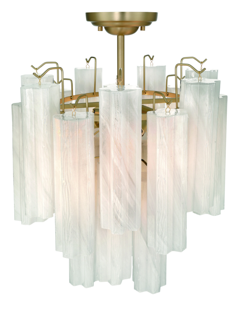 The semi flushmount from the Sophia collection captivates with its cascading arrangement of ornate “Tronchi” style Wispy White glassware, reminiscent of shimmering icicles. Each glass element delicately refracts light, creating an enchanting glow, while the warm brass frame provides a refined contrast, evoking a sense of luxury. Perfect for classic and modern interiors alike, this design transforms any space into a haven of timeless beauty.
