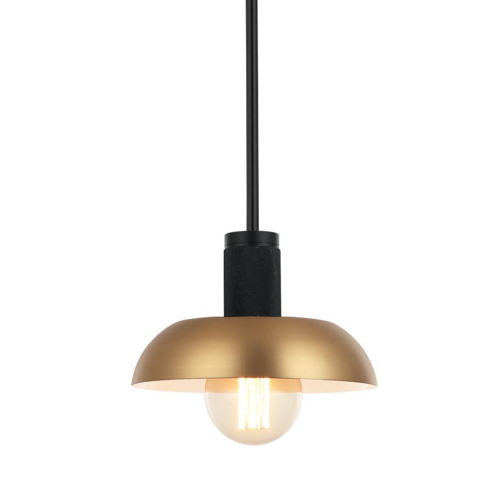 The Aurora Pendant Light features a Aged Brass metal dome shade with 2x12" & 2x6" threaded Black Rods 4.75" diameter Canopy.