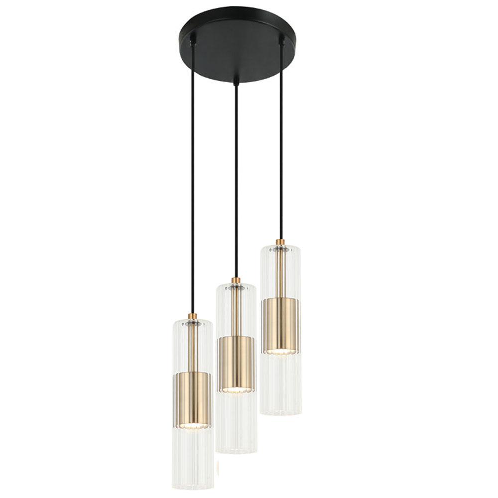 3 Light 10" dia. Canopy - Black Cloth Cord Pendant with Clear Ribbed Cylinder Glass in Aged Brass Finish with a Black Canopy.