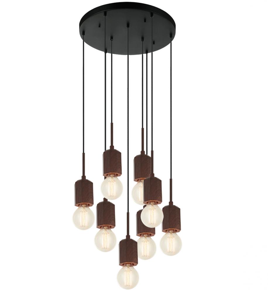96" Cord - 8 Light Faux Walnut Wood Socket Cup with Black Cloth Cord on a 16" Diameter Black Canopy.