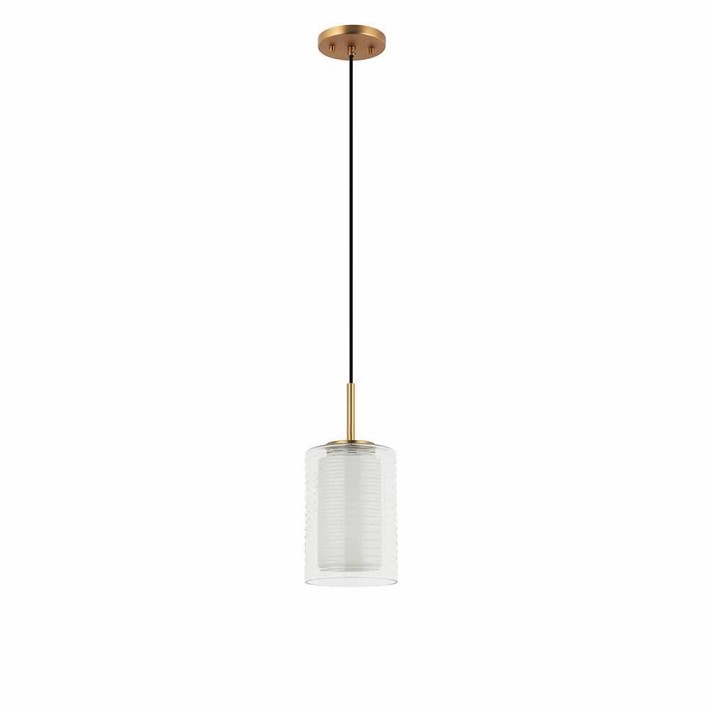 Pendant with Clear Ribbed Cylinder Outer Glass & Satin White Inner Glass in Aged Brass Finish with Black Cord