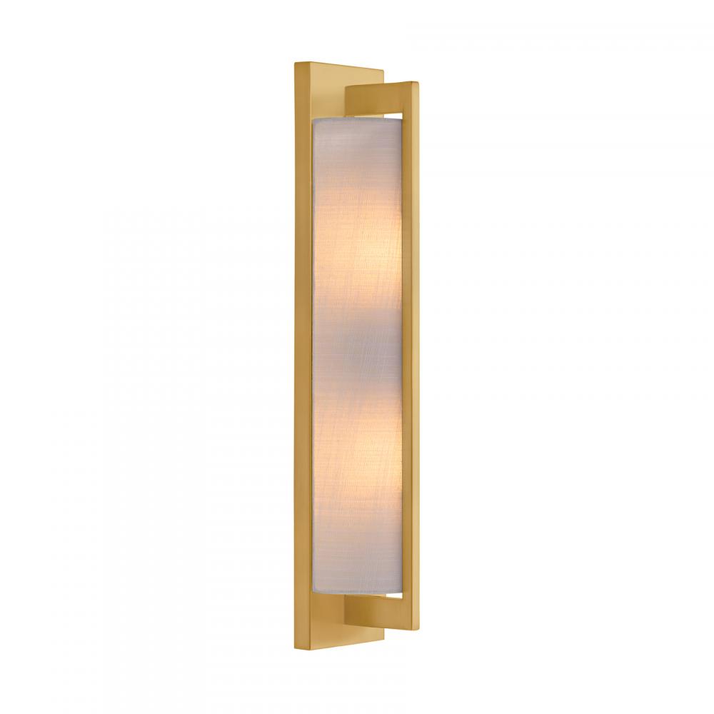 The Savoy House Carver 2-light sconce is oh so sleek and oh so chic. A long, tall white fabric shade is held to the backplate by an arm that overlaps the shade to create a sense of symmetry and is decorated with a Warm Brass finish. Carver is 22" in height, 4.5" in width and extends 4" from the wall. Uses two candelabra size bulbs of up to 40 watts per bulb. Bulbs not included.
